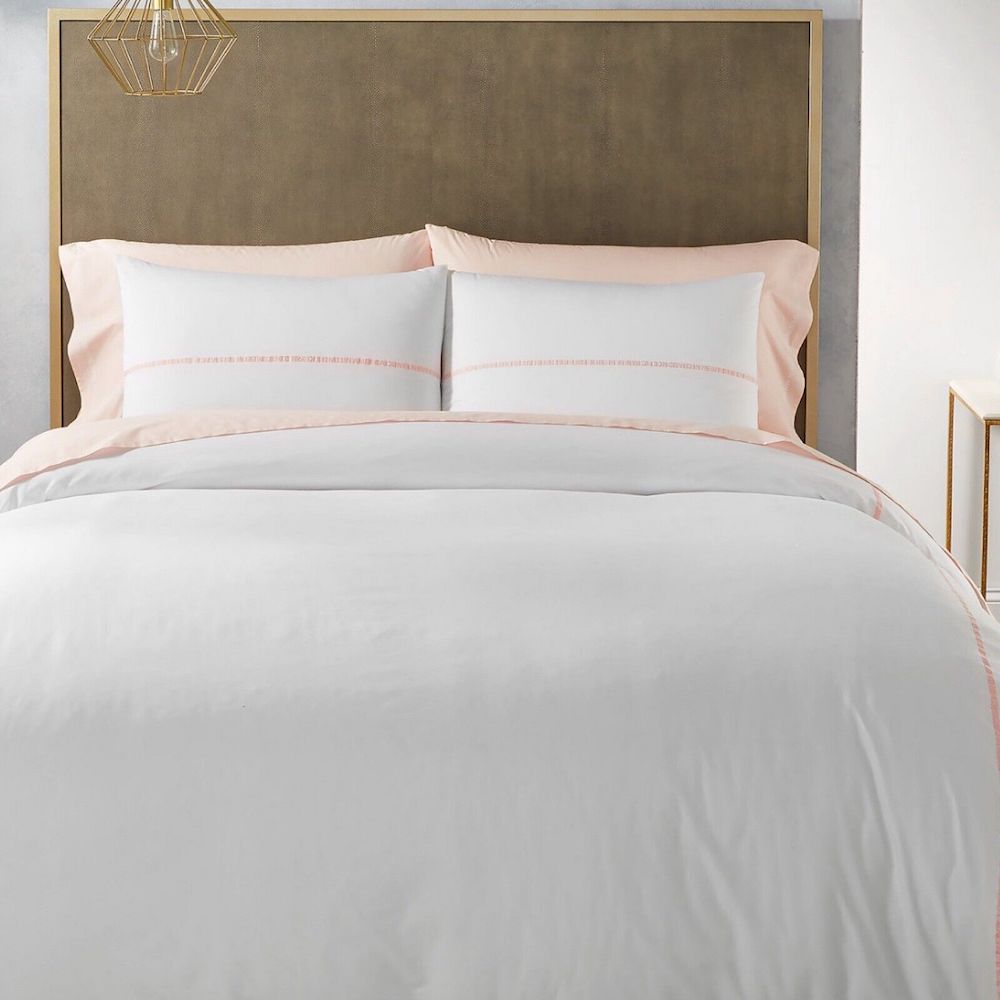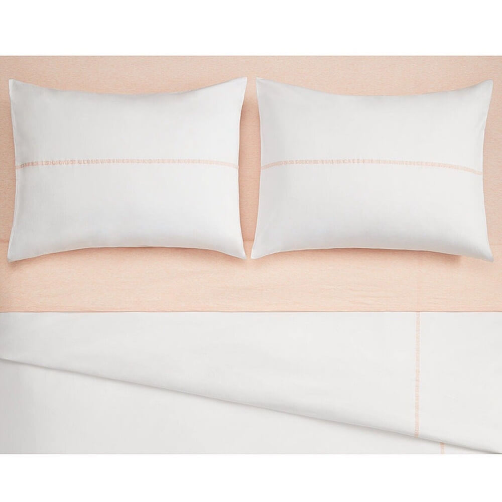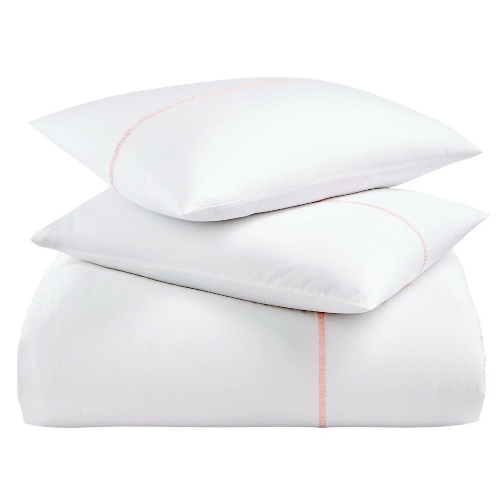 A minimalist duvet set with trim accents echoing Calvin Klein’s iconic American design heritage: CALVIN KLEIN EST. 1968 DESIGNED IN AMERICA NYC 205 W39 ST. Pink woven logo detail adorns the right side of the duvet and the center of the shams.
