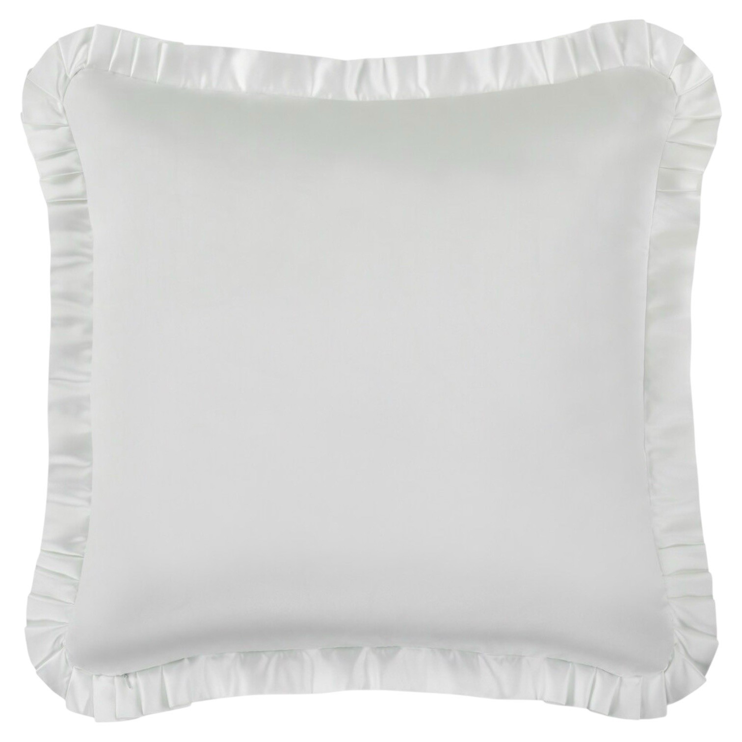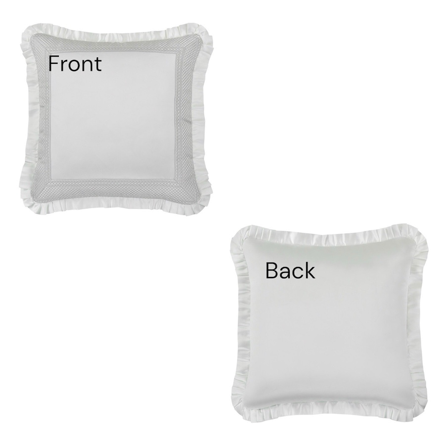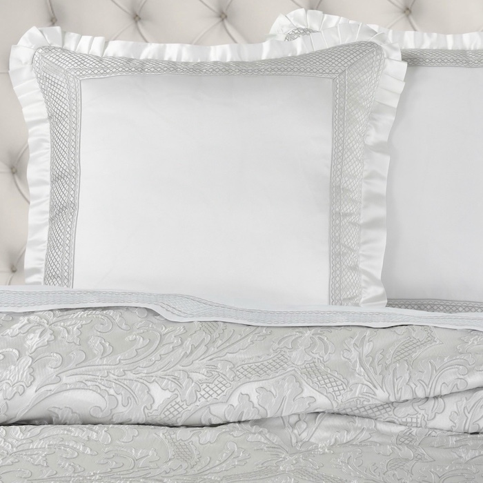 The Brunello European features a satin center with a white and platinum jacquard border, creating a sophisticated and timeless look.
