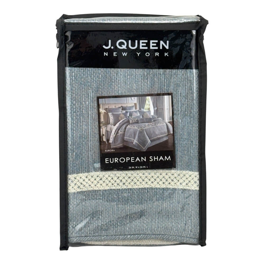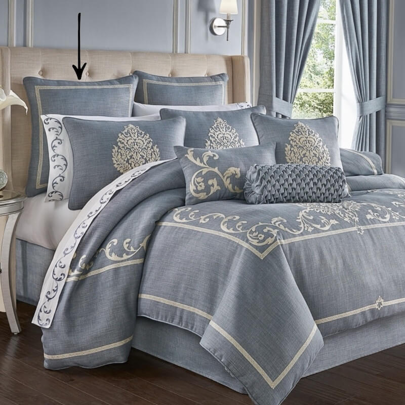 The Aurora euro sham features a classic ivory border with crewel embroidery, blue piping, and a hidden zipper.
