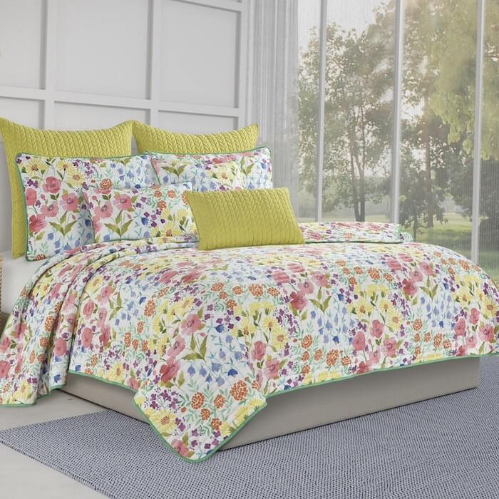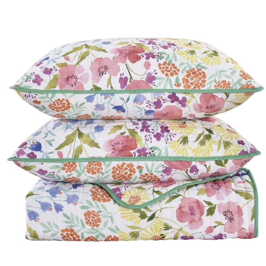 Brighten your bedroom year-round with the Jules Quilt Set, featuring a colorful wildflower print on plush, lightweight microfiber with teal piping for a cheerful touch.