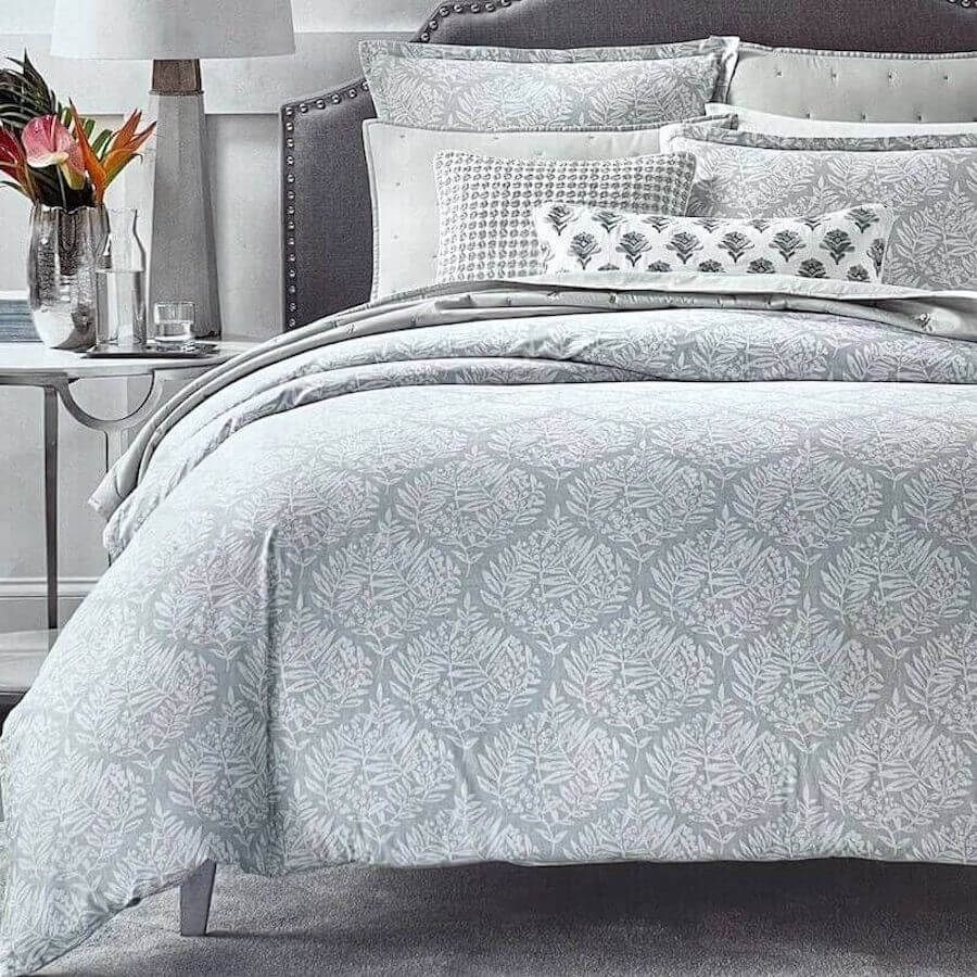 The Sky Woodblock Flora Duvet Set in gray boasts a chic floral pattern featuring shades of grey on a pristine white backdrop.